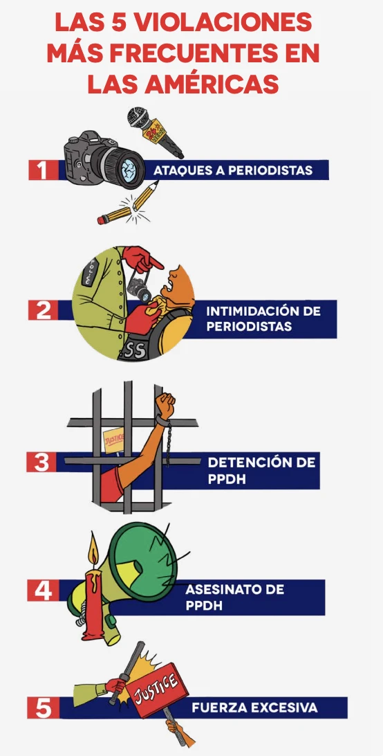 "Las detenciones de PDDH figuran por primera vez entre las cinco violaciones más frecuentes de la región. Se registraron casos en al menos doce países, entre ellos Argentina, Dominica, Ecuador, El Salvador, México y Paraguay. Las autoridades recurren cada vez más al derecho penal para catalogar a los activistas como delincuentes, enemigos o terroristas, y no dudan en utilizar la difamación, las acusaciones imprecisas y las detenciones preventivas prolongadas para silenciarlos." sostiene el informe.