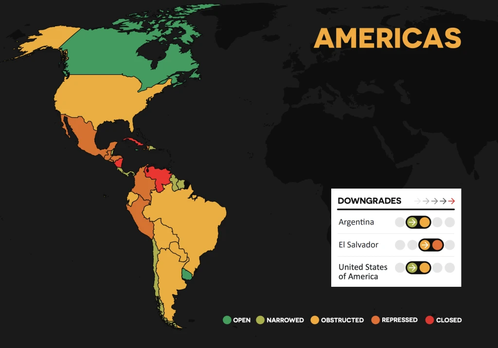 El informe advierte que solo 39 de 198 países tienen hoy un espacio cívico plenamente abierto, mientras que el 73% de la población global vive en espacios restringidos. Argentina ahora se suma al grupo en retroceso del que no solia ser parte.