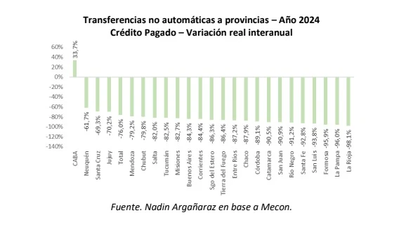 - En 2024, las transferencias no automáticas a las provincias sufrieron una caída real del 76,0%