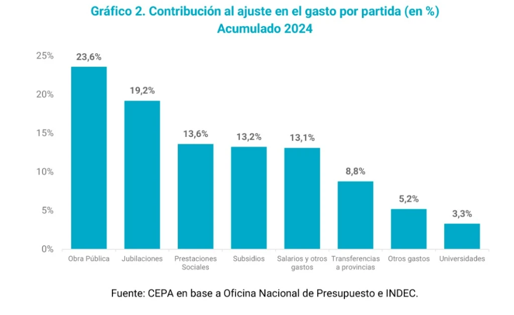 Según datos del Instituto Argentino de Análisis Fiscal (IARAF), las transferencias automáticas a las provincias cayeron un 10% en 2024 en términos reales, debido a la recesión económica y la reducción de la recaudación. Sin embargo, el mayor ajuste se dio en las transferencias discrecionales, que disminuyeron un 78,2% en términos reales en comparación con 2023, según la Oficina Nacional de Presupuesto